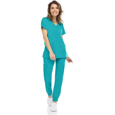 MediChic Women's V-Neck Scrub Set Straight Leg Six Pocket Cargo Scrub Pants with 4-Way Stretch Scrubs Sets, Teal Medium