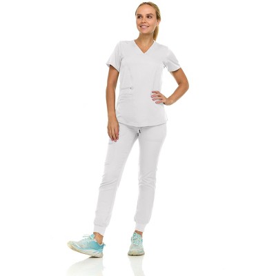 MediChic Women's V-Neck Scrub Set Straight Leg Six Pocket Cargo Scrub Pants with 4-Way Stretch Scrubs Sets, White Medium