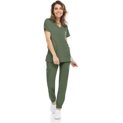 • Manufactured in 4-way stretch fabric, these scrub tops contain three methodical pockets and side slits for ultimate freedom, and the joggers contain three pockets and a cargo.