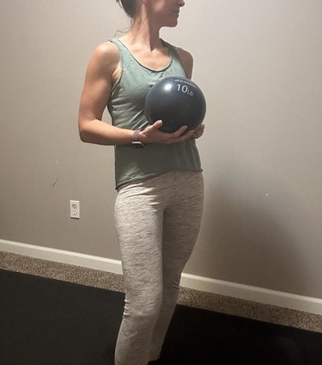 This is my new go-to medicine ball. It’s the perfect size for my smaller hands and the texture allows for a solid grip. The ball is filled with sand and has a little give, meaning it isn’t too hard, for an easier hold. I do not slam medicine balls, so I don’t have a recommendation there. The ball feels durable enough, however I know there are specialized medicine balls specific for that use. The weight felt true to 10lbs. There also appears to be an inflation point on the ball.