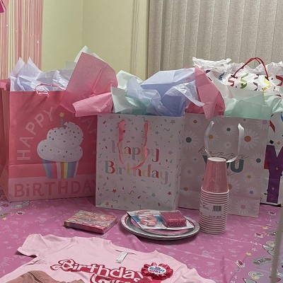 Add a fun twist to your birthday present with this Medium Birthday Gift Bag with Glitter from Spritz™. Adorned with ''Happy Birthday'' written on glitter detailed stars and party hats for charming flair, this medium paper gift bag is the perfect size for any medium to small gift, and is great for birthday presents. Plus, the soft fabric handles make for easy carrying. Just pop the gift in and dress it up in a nest of matching tissue paper, and get ready to gift.