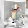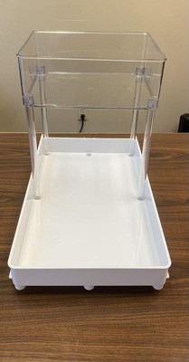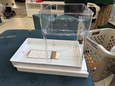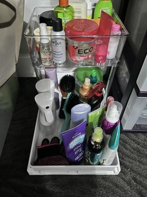 Keep your bathroom cabinet organized with this Medium Gliding Tray with Shelf from Brightroom™. Made of recycled PET and post-consumer recycled plastic, this cabinet organizer features a clear shelf on the top and a base gliding tray to store your everyday essentials. Featuring raised edges, this tray with a shelf glides smoothly to easily access hard-to-reach items. Designed for indoor use, it fits most standard cabinets.
