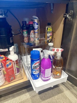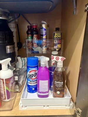 This is an excellent piece for under sink storage. I’m using it under my kitchen sink to store kitchen and cleaning supplies, but it would also be great in a bathroom or even on a shelf in a utility room or garage. It’s very durable and holds quite a bit! The bottom tray is deep enough that products won’t fall out and the top tray is as well.