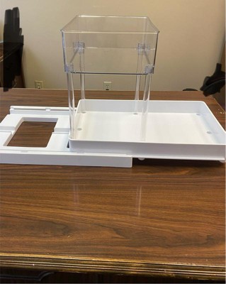 This product is very practical. It was easy to assemble and even easier to use with my products. It has a tray at the bottom that glides forward and can hold a good amount of items. It has a clear top tray about half the size of the lower tray that stacks onto four removable plastic rods that connect the trays. This will be such a space saver for me.