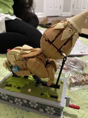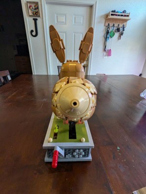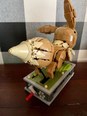 [This review was collected as part of a promotion.] How cute is this? My teens put it together in about 3 hours. You can switch the name plate out to 3 different languages. The back has clear blocks, so you can see the mechanisms working. It’s a great size, not “small” in any way. The ears can be positioned however you want. I just love the whole moving concept and hope to buy different versions, in the future. I’d definitely recommend this to any block builders out there. My oldest is 20 and always preferred Mega Blocks. My video is wonky because I was trying to hold my phone. But it turns fairly smooth.