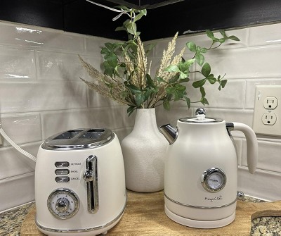 Add a touch of elegance with the MegaChef 1.7 Quart Electric Tea Kettle and 2 Slice Toaster Combo in Matte Cream. Beautiful Matt Cream color with Silver accents brings in a subtle touch of color with a bold statement. Retro design fits in perfectly with any kitchen. Easy to operate buttons and dials. Kettle features an easy to ready thermostat allowing you to monitor boil temperatures and transparent water level. Toaster features 6 browning setting with Defrost, Bagel and Cancel functions.