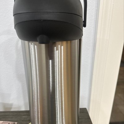Upgrade your coffee and beverage area with this MegaChef 5 Liter Stainless Steel Vacuum Body Pump Cap Air Pot. The stainless steel insulated pot will keep your drinks perfectly hot or cold. Simply press down on the large button on top of the machine to have your drink dispensed or use the button lock feature to prevent accidental spills. A 360 degree swivel base and carrying handle makes this all the more easy and convenient to use and move around. To fill the air pot, just pop open the top and pour in your beverage. When it's time to clean, the pump shaft is removable for proper cleaning. This air pot is all you need for your coffee, hot chocolate, apple cider, and so much more in your office and home!