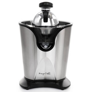 Enjoy a fresh cup of citrus juice with the MegaChef Stainless Steel Electric Motorized Press Citrus Juicer. Squeezes every delicious drop of juice from any citrus fruits by gently pushing the top handle. This essential kitchen tool features a reamer that accommodates large and small fruits with complete extraction. dishwasher safe removable parts for fast and easy cleaning.