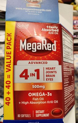 MegaRed Advanced 4 in 1 is a special combination of high concentration fish oil and high absorption krill oil that has 2 times more Omega 3s vs. standard fish oil alone. Our most advanced Omega-3 supplement to date brought to you by one of the leaders in omega 3 supplements, MegaRed. This advanced formula goes beyond just heart health. MegaRed 4in1 supports and provides benefits to 4 areas in the body - heart, joint, brain and eyes. Heart - May reduce the risk of coronary heart disease.** Joint- Promotes joint comfort.* Brain - Supports brain health.* Eyes - Building block for eye health.* *These statements have not been evaluated by the food and drug administration. This product is not intended to diagnose, treat, cure or prevent any disease. **Supportive, but not conclusive research shows that consumption of EPA & DHA Omega-3 fatty acids may reduce the risk of coronary heart disease.