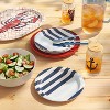Elevate your table settings with this Melamine Salad Plate from Room Essentials™. Made from BPA-free bamboo and melamine material, this salad plate features a navy and light- blue striped pattern on a white backdrop for a fun look. Ideal for everyday use and entertaining, this round salad plate is safe to use in the dishwasher for easy cleaning.