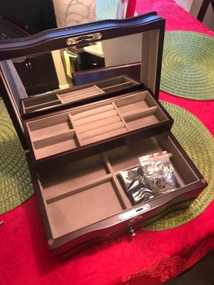 Beautiful box. Love the finish and that it locks the top portion. I bought it as a gift for my Queen and the only thing I knocked it down one star for was that it doesn't lock the box completely. She recently had a diamond necklace of hers stolen and I was hoping to find her one to keep all of her items safe. Outside of that, it was exactly what I was looking for. And it arrived exactly when they said it would.