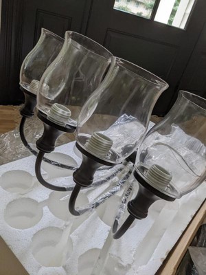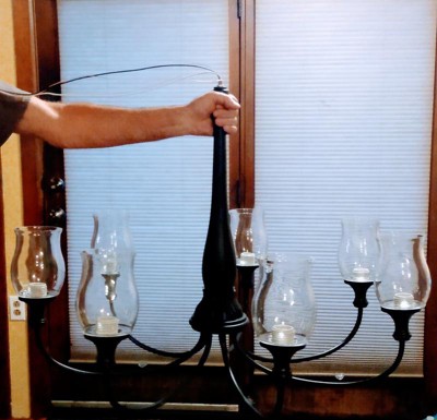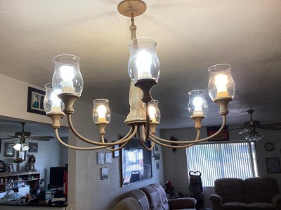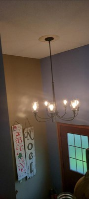 [This review was collected as part of a promotion.] Beautiful Chandelier! I love the way that it looks. The glass votives are shaped beautifully and stand out! It was easy for us to install and it looks great hung up! The way it looks fits perfect with our other farmhouse looking decor!