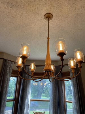 [This review was collected as part of a promotion.] This chandelier is so much prettier than I had hoped for and was a perfect addition to our dining room. The metal parts have a straight woodgrain finish that gives it a vintage vibe, while the light maple color makes it more warm and not too formal. The glass shades are very clear and give such a lovely sparkle to the light. We added 60-Watt flame shaped bulbs and it looks awesome and provides so much light to our open kitchen plan. The arms come pre-assembled, and there was also a mounting hook included so the fixture can hang while you connect the wires, which made installation not only safer but easier too. We are absolutely over the moon with this piece!