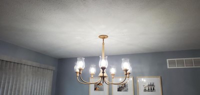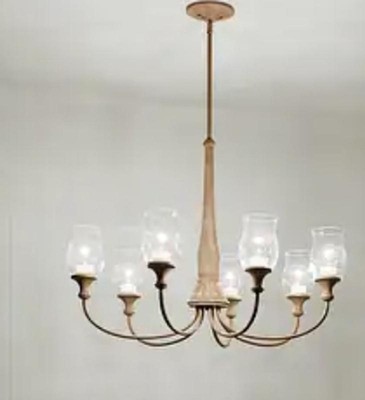 [This review was collected as part of a promotion.] It is a very pretty chandelier and brightens the room right up. It looks somewhat old fashion, but yet modern at the same time. The whole light is pretty heavy and it took the two of us to get it in place. We previously had a support bar for our light and it came in quite handy for this one as it is heavy hanging. The light came with a long drop bar but we had to shorten it for our ceiling. It is a beautiful maple wood base with 7 light with clear glass globes. It adds a bit of elegance to the room. It took my husband and I about a half an hour to install it.