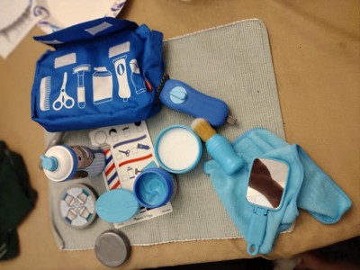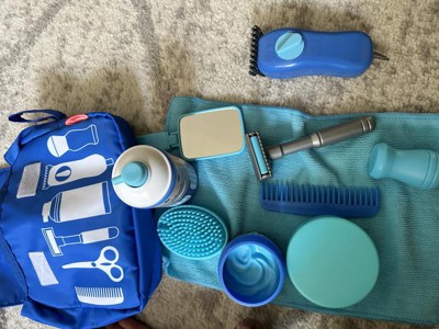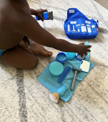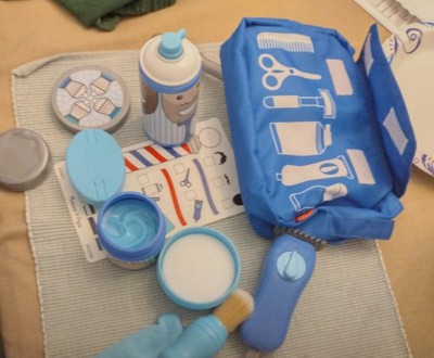 [This review was collected as part of a promotion.] This is literally so so cute. The pull the string on the fake electric razor to make sounds is so fun and will hopefully teach my toddler not to be scared of future hair cuts. The fake beard and the play mirror and scissors are all so fun and well made. My son loves how soft the powder brush is. I do wish the blue bag was just a little bit bigger.