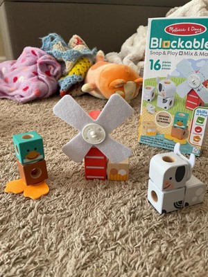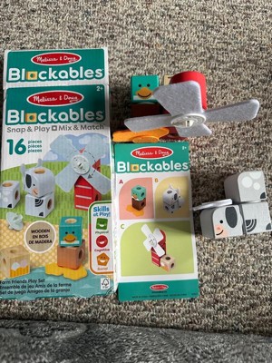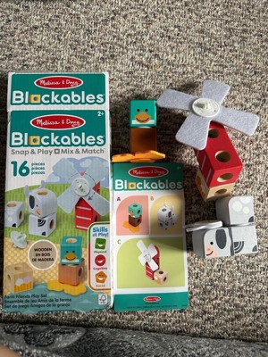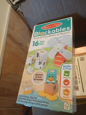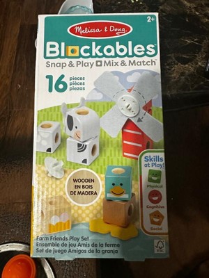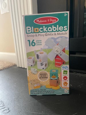 - Melissa & Doug Blockables™ are connectable, stackable, and playable solid wood building blocks, perfect for little hands and big imaginations; special connectors let kids 2 and older easily snap together smooth, colorful blocks to create a fun barnyard to play with, or combine to build their own silly characters and cool creations