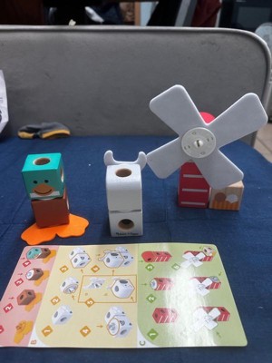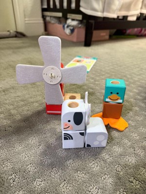 - Farm Friends Play Set Includes 8 wooden blocks, 5 connectors, felt goat horns, duck feet, and spinning windmill with built-in connectors, and illustrated instructions
