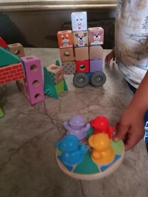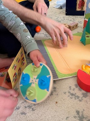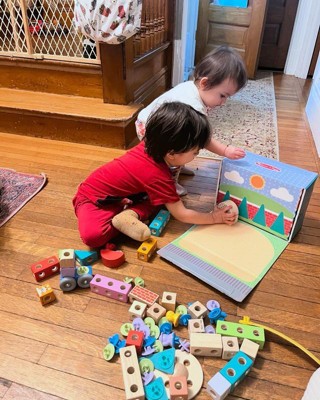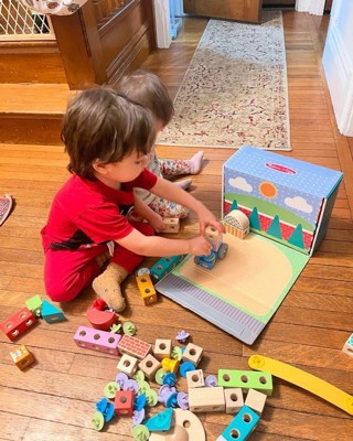 Melissa & Doug Blockables™ are connectable, stackable, and playable! The solid wood connect-and-play building blocks are perfect manipulatives to help preschoolers two and older boost developmental skills (fine motor, problem-solving, matching, storytelling, and self-esteem), while using their imaginations and having fun. Easy-to-grasp smooth, colorful wooden blocks fit together in a snap with large connectors that even little hands can push in and pull out. An illustrated guide shows how to arrange and link the Blockables™ to create a multi-textured neighborhood playground (swing, rocker, carousel, vehicle, pets, buildings, and more), or kids can use their imaginations to mix, match, and combine pieces to make unique creations and play their own way! Kids can easily expand their collection -- the 73-piece Town Play Set is compatible with all other Blockables™ play sets. The packaging folds out to convert into a fun play space and pieces store in the sturdy corrugated box with a soft handle for easy cleanup and portability. Patent pending.