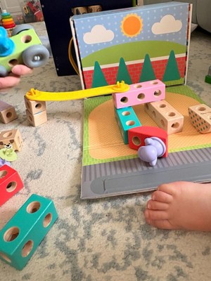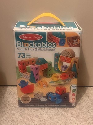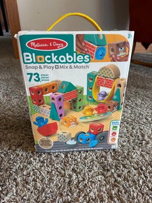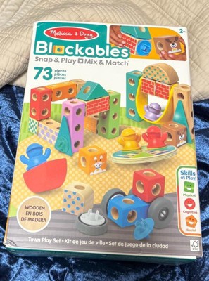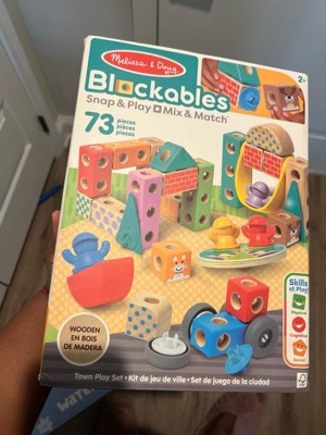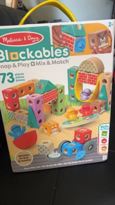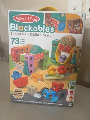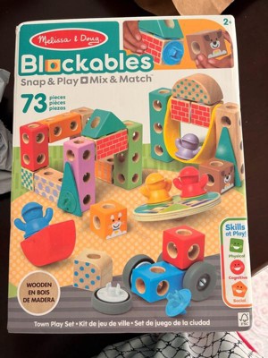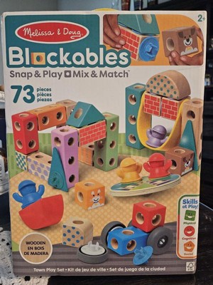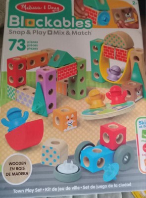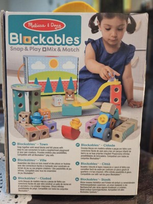 - Melissa & Doug Blockables™ are connectable, stackable, and playable solid wood building blocks, perfect for little hands and big imaginations; special connectors let kids 2 and older easily snap together smooth, colorful blocks to create a fun neighborhood playground and vehicle to play with, or combine to build their own silly and cool creations