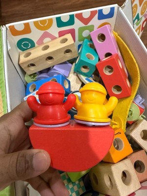 [This review was collected as part of a promotion.] I loved this toy!! They are perfect for little hands and pretty colorful. Made out of wood, and so far, I have not seen any chocking hazard pieces. Package was perfect with a handle.
