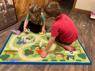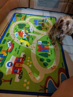[This review was collected as part of a promotion.] There are lots of different places to visit on the rug. It is large enough for my two kids to play on. We've tried other rugs, but this one is nice since it has short fibers that the characters can stand up on and allow the bus to move around easily! A++