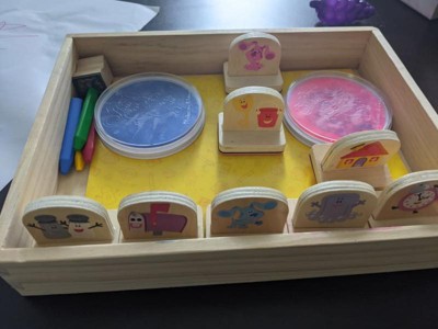 [This review was collected as part of a promotion.] Cute stamp set. Sturdy wood. Bright ink stamps well. I loved blues clues when I was a kid and my kids love it to. Im glad to see them making the toys again. A few years ago my son loved it and we couldn't find anything blues clues. Only thing I didn't like is i wish the box had a lid to keep it all together. The wooden box was like all the m&d toys.
