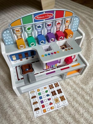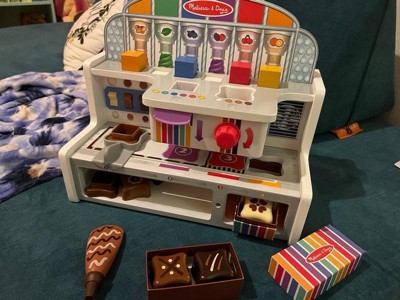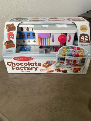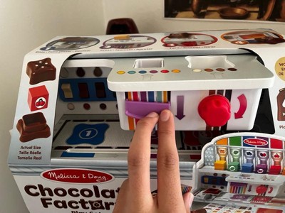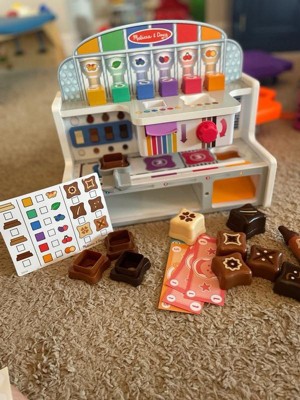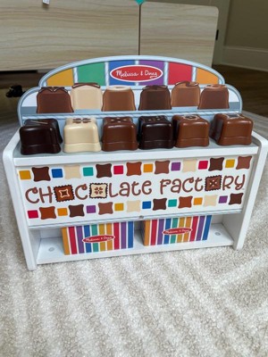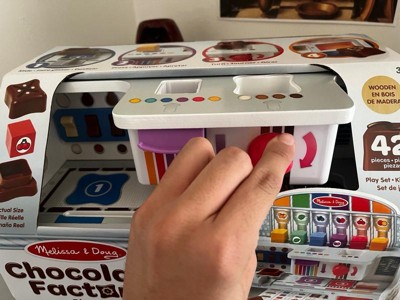 - Sweeten up playtime at the Melissa & Doug Wooden Chocolate Factory by mixing and matching pretend play candy shells, tops, and fillings; move the sliding conveyor, flip fidget switches, push a lever, turn a dial to make candies automatically drop into place