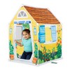 space for multiple kids to play. The cottage exterior is covered with vibrant, full-color artwork, bringing to life a vegetable garden, tire swing, doghouse, and more. This unique play space is packed with playful details, such as a front door with a flap that rolls up, window shutters that open and close, a working mail slot, mesh fabric in the roof peak and windows, and durable floor material. It even comes with a reusable postcard to drop in the mail slot! The play tent is easy to assemble and easy to pack away in the handy take-along storage tote. Kids three and older will make this “home base” for imaginative play for years to come!