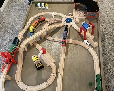 This amazing set includes everything needed for railway fun: a spacious roundhouse engine shed, dozens of track pieces in curves and straights, trees, workers and even traffic signs; multi-piece trains; magnetic-tipped cranes; switches and a T-junction for changing course; suspension bridge, trestle bridge and roundtable, too! A tremendous value! Mix and match it with other train sets--it's compatible with all popular wooden railway systems.