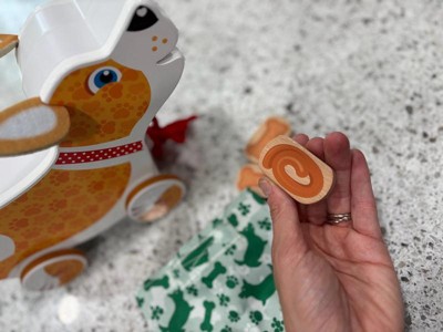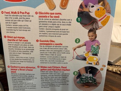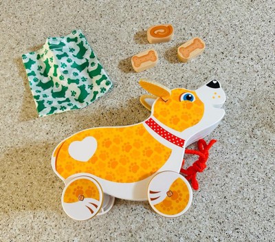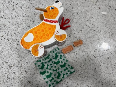 - Includes wooden puppy pull-toy with attached leash and wheels, 3 wooden double-sided treats/poos, reversible bag for treat storage and poo cleanup