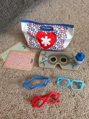- Includes 3 kid-sized durable plastic eye glass frames, a wooden exam tool with rotating color wheels, eye drops bottle, eye cover, 2 double-sided exam cards, mirror (hold the handle, or fold to stand upright), shopping tote