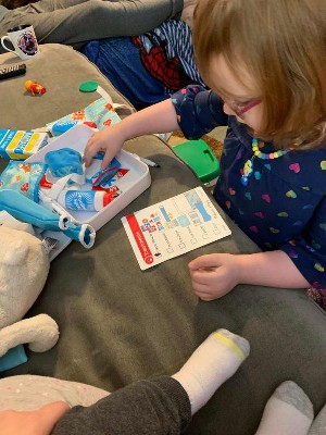 My 4.5 year old daughter just got this kit and she has been giving her 18-month-old brother lots of exams! She loves going down the checklist and he sits patiently and enjoys the attention. I was so impressed that there were actual pretend bandages in the box and the gauze/wipe pockets have zipper seals so they can be reused. M&D always get all the details!