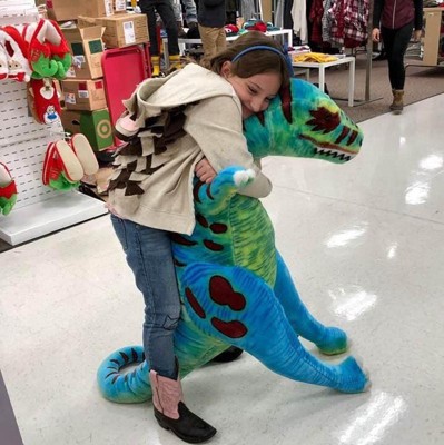My daughter found this in a Target display 4 years ago and fell in love! 4 years later and the dinosaur is still happily living it’s best life standing in the corner of her bedroom. The tail has some bend in it (presumably has wire run through it) and can be manipulated to help with balance. Every so often Dino will start falling over a lot, so I just fuss with the tail until it’s more stable again.