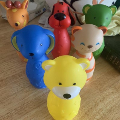 We got a set of these as a present, and our daughter (19 months) is obsessed with the pins. She carries them around, arranges them, and chats with them. She doesn't really care about the bowling aspect, but the animal pins are just her favorite toys. I would like feedback, though, on what each of the animals are supposed to be. Four are pretty obvious, but the green and blue are kind of ambiguous. I think it's a mouse and bunny? But I'd really appreciate confirmation on those.