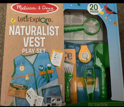 - 20-piece naturalist play set with vest and other essentials for observing, collecting, and cataloging insects, rocks, seeds, plants, and leaves