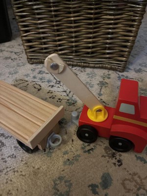 - Includes red truck with magnetic arm, car-carrier trailer, and 4 magnetic wooden cars