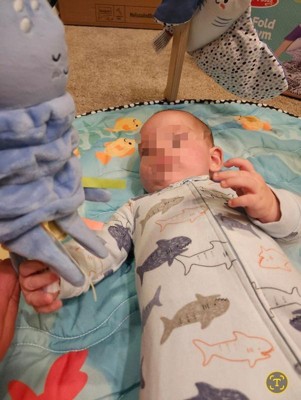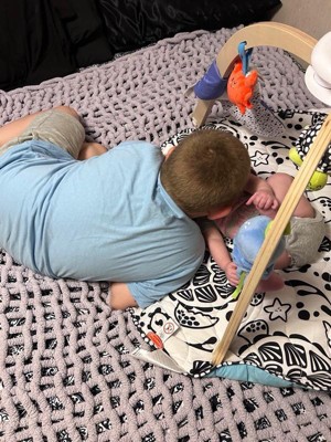 [This review was collected as part of a promotion.] If I could rate this higher than 5 stars, I would! This baby gym has made such a wonderful addition to our days at home with our 4 month old. He absolutely loves all of the toys (especially the crab & starfish) and I love that the toys all feature a different sensory experience. As a bonus each toy, & the mat itself, are machine washable. I also appreciate that this play gym features an easy way to fold it up and store it away as needed. It’s also reversible & has a black and white pattern as well which gives you options based on preference or to coordinate with your home decor.