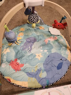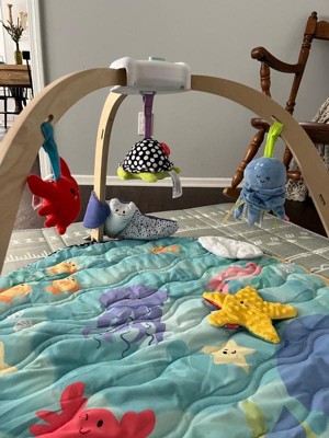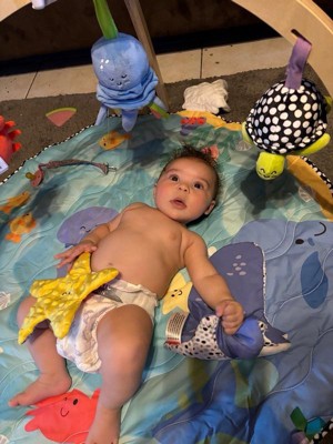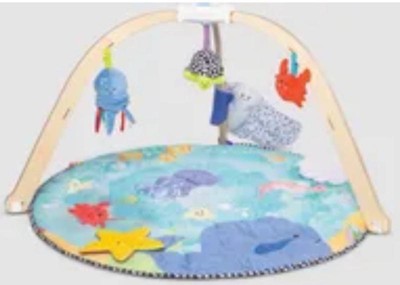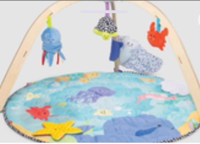 [This review was collected as part of a promotion.] I recently received the Melissa & Doug Ocean Easy-Fold Play Gym in exchange for my honest review, and it has been a fantastic addition to our baby gear collection. The quality and durability are exceptional, with sturdy and safe materials that can handle daily use by an active baby. The spacious design provides ample room for movement and tummy time, making it comfortable and engaging. The play gym includes five sensory-stimulating toys: a chime, a vibrating toy, a crinkle toy, a rattle, and a squeaker. These toys help my baby develop by introducing different sounds, vibrant colors, and varied textures. The reversible mat is machine washable, making cleanup easy and keeping the play gym hygienic. The wooden frame is aesthetically pleasing and functional, easy to assemble, and can be quickly folded for storage or transport. Overall, I highly recommend the Melissa & Doug Ocean Easy-Fold Play Gym for its combination of durability, spaciousness, and sensory toys. It’s a great investment for any parent wanting to provide a fun and developmental environment for their baby.