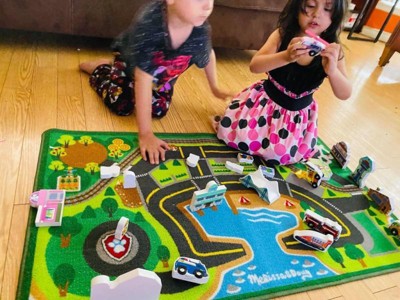 [This review was collected as part of a promotion.] My kids love to play on this rug, they are 3 and 5 years old, the rug is very soft and anti-skid, it comes with lots of vehicles and play pieces, these toys allow my kids to have great playtime and use their imagination. I love that the rug is washable and high quality, the toys are made of wood and super cute. My kids love paw patrol and cars, so this playset is perfect for them, it helps to avoid using electronics and play pretend with different toys and cars! Awesome Rug and toys!