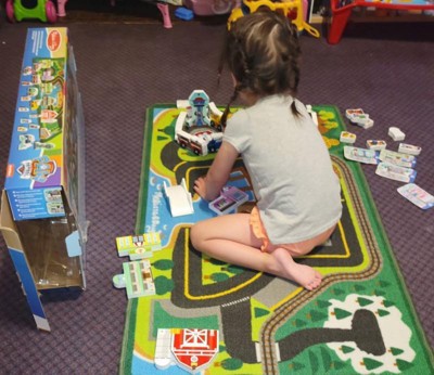 Our grandboy loves this rug of Paw Patrol figurines etc. He uses his imagination while paw patrol doggies save the day. And, he gets GrandMa on the floor playing it too. Yikes.
