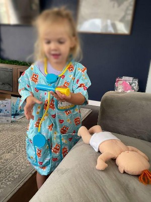 This pediatric nurse costume and play set has everything little nurses need to take care of a newborn baby--including the baby! Nurses-in-training can slip on the cheerful, gender-neutral uniform (complete with customizable hospital ID tag), then fill the pockets with tools for a pretend-play checkup. The included stethoscope, ear scope, thermometer, and syringe help make sure all is well with the cuddly newborn--or help patch up any imaginary booboos and sniffles. The plush baby doll has a removable cloth diaper with self-stick closures for easy changes before or after the checkup, and a sweet smiling face to encourage emotional connection and communication.