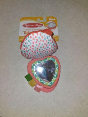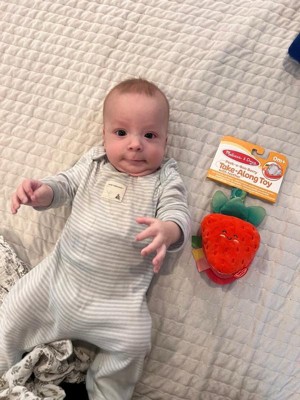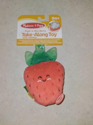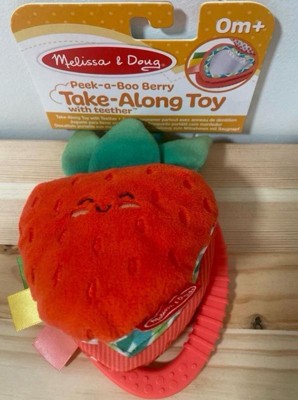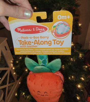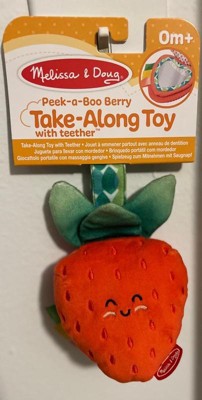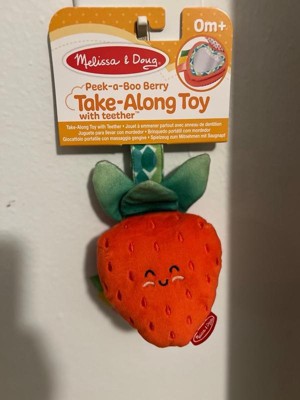 - Attach the 3-piece Melissa & Doug strawberry infant toy with peek-a-boo mirror and silicone teething ring to strollers, diaper bags, high chairs, car seats, and more to keep the fun close at hand