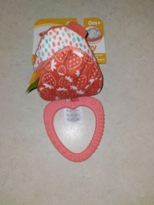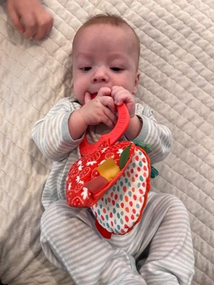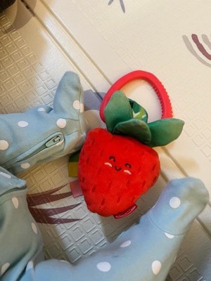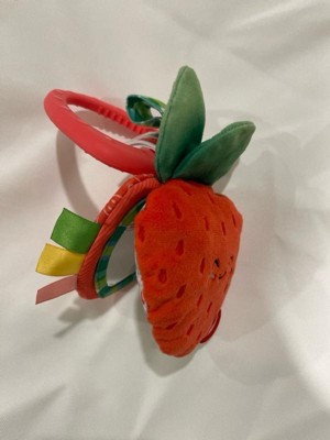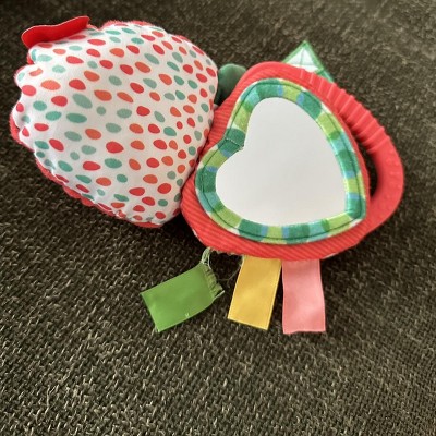 - Includes 3 strawberry multi-textured slices with crinkling leaves, a peek-a-boo mirror, satiny ribbons, and a teething ring