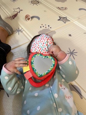 [This review was collected as part of a promotion.] This developmental strawberry toy is so cute. Very easy to open to use teether or the mirror. Sophia loves the toy, it catches her attention with the colors and textures. It so easy to add to car seat handle and keeps her busy.