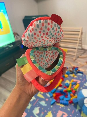 [This review was collected as part of a promotion.] The most perfect on the go little strawberry development toy. My little one is 4 month old and he loves holding on to the teether and putting into his mouth. I like that it’s not too small and it’s a good size for him to grab onto it. The toy comes with 3 folds ( soft strawberry/ mirror/ and teether) I like that’s the little velcro can be put higher or lower depending on where you need it to go. Definitely going to be out favorite toy to take anywhere it’s so adorable.