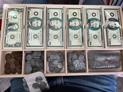 This review is specific to people who are looking to purchase this toy for kids to use in a home-based setting. Heed my warning and don't do it. Sure, the tray is nice and the money is of a very good quality, but there is too much of it. TOO. MUCH. If you bring this into your home, it will scatter everywhere. You will find it in and under beds, in drawers, inside of books, inside approximately 38 different bags at the same time, in your mixing bowls, under your rugs, smushed into the corner behind the bathroom door, and constantly in your pockets as you jam it in there in a futile attempt to control the outbreak that has infiltrated every nook and cranny of your dwelling space. Trust me, go to a dollar store and get a nice little play money set with like fifteen or so pieces.