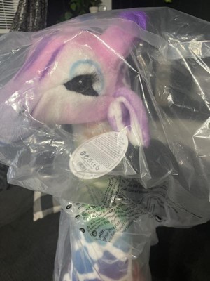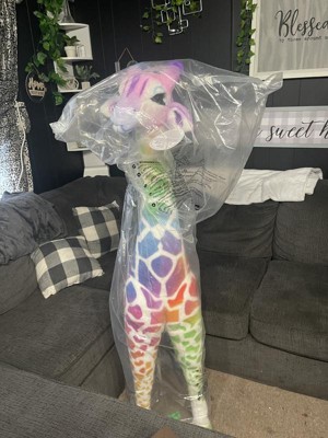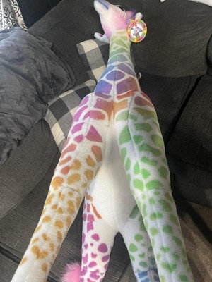 - Soft fur with ombre red, orange, yellow, green, blue, and purple giraffe spots is surface washable; sturdy construction and a strong interior structure helps it stand tall through years of hugs and cuddling