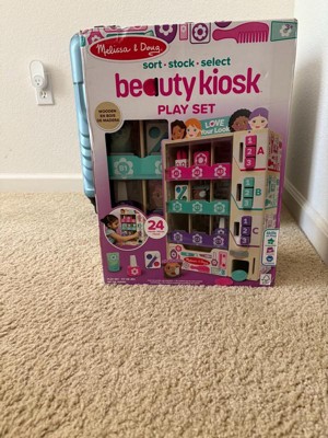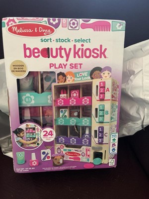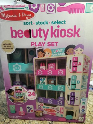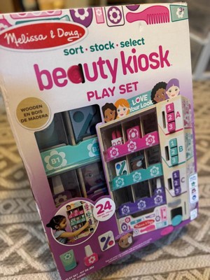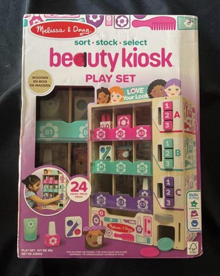 - The Melissa & Doug Sort, Stock, Select Beauty Kiosk Play Set lets kids sort pretend play beauty items by color (DOES NOT CONTAIN REAL NAIL POLISH OR OTHER COSMETICS), stock the wooden vending machine, then insert play coins and make a selection by pressing the corresponding button so items fall into the collection drawer