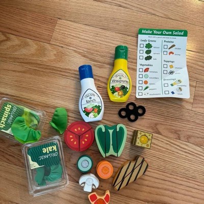 - 28-piece play set includes wooden spinner lid, spinner basket, salad bowl, plush head of lettuce with 8 peel-off fabric lettuce leaves, 3 felt peppers, 3 wooden cucumbers, 3 wooden tomatoes, 3 wooden croutons, wooden rotating salt and pepper grinder, olive oil bottle, tongs, reusable activity card