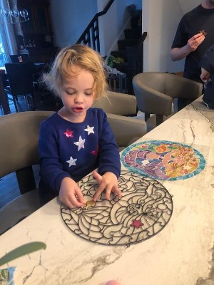 Our 4year old grand daughter loved this project. She is into mermaid anything and she loves to create. The stained glass pieces were easy to place. She is good with shapes so matching things to where they go was perfect. Nice sized craft and not overwhelming for a busy mind and hands.